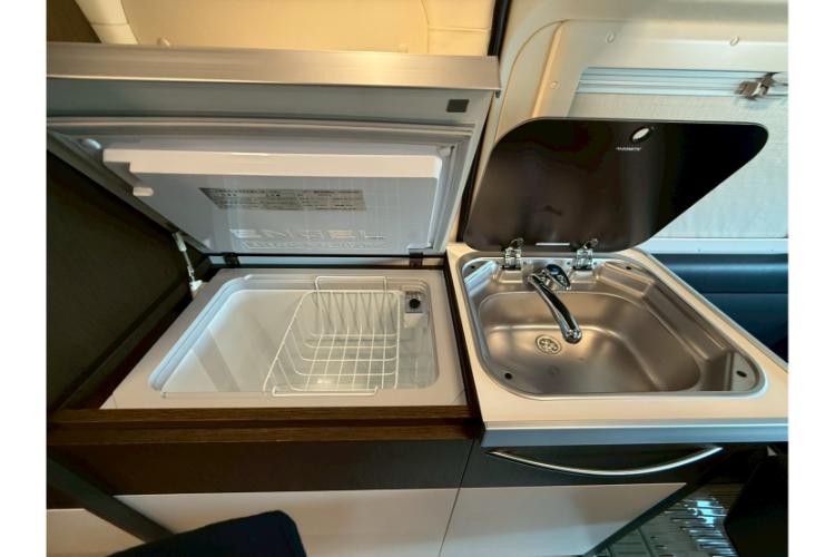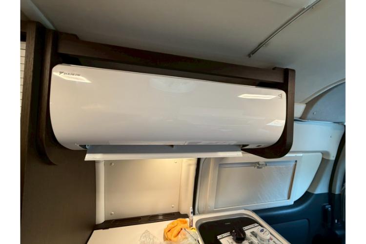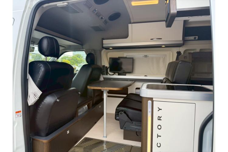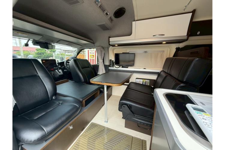 シンクや冷蔵庫、電子レンジも備え付けられているので、車内でも料理を楽しめます。さらに、夏でも涼しく過ごせる家庭用エアコンや、冬に大活躍するFFヒーター、換気に役立つMAXファンも完備。快適な車内空間で、自宅にいるかのようにくつろげます。