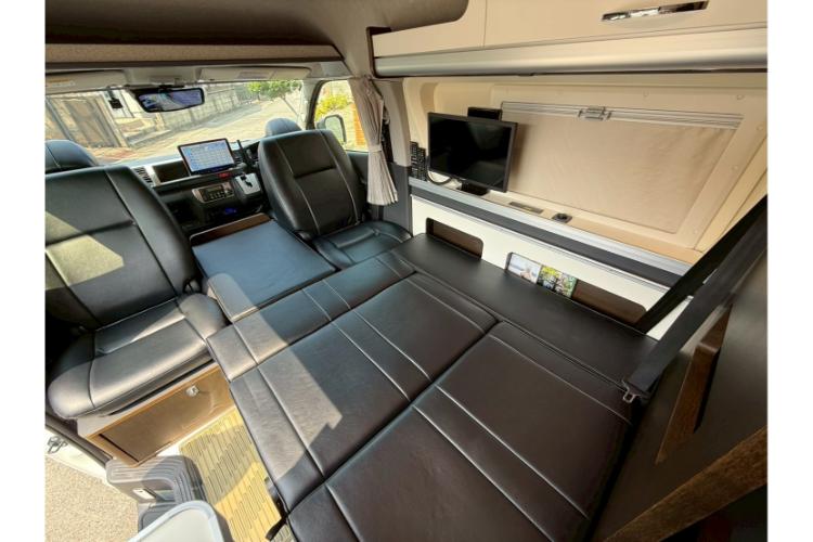 また、車内で過ごす時間をさらに豊かにする装備も魅力です。アルパイン11インチのナビや、マルチカーシアターシステムで映画鑑賞も楽しめます。大容量のリチウムイオンバッテリーやソーラーパネル、外部充電にも対応しているので、電源の心配もいりません。ポータブル電源用の充電口も備え付けてあり、長期間の旅行でも安心して電気を使えます。