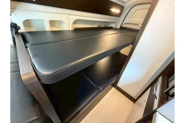 車内には、広々とした常設2段ベッドを完備。上段ベッドは長さ1,950mm、幅755mm、下段ベッドは長さ1,950mm、幅765mmと、大人でもゆったりと足を伸ばして眠れます。エキストラベッドを使えば、さらに2名が就寝可能です。