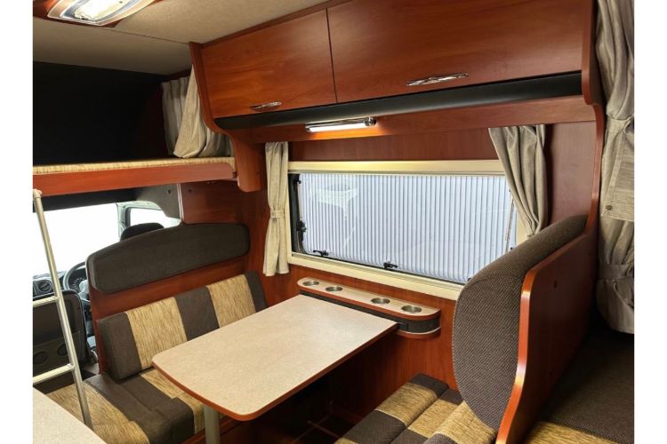 この車両は、快眠とくつろぎをテーマにしたお車で、マルチルームをなくすことで開放的な空間を作り出しました。車内には実用的な1,400㎜サイズのダブルベッドがあり、ベッド部はカーテンで仕切ることができ、パーソナルスペースができあがります。室内は広々としており、ダイネットやスライド式バンクベッドも備えています。また、システムキッチンにも様々な工夫が施され、ガラス蓋式シンクは閉じると調理台に使えるなど、たくさんの収納スペースがあり便利です。常設ダブルベッドは、オリジナル専用マットレスを採用しており、上質な寝心地を提供しています。
