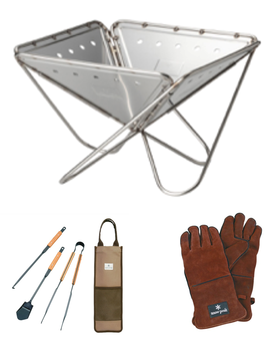 スノーピーク製焚火セット、焚火台Lスターターセット、火バサミ1個、耐火用グローブ1双