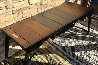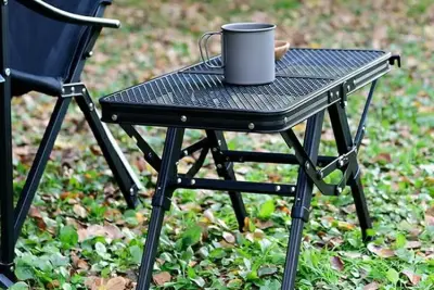 天板と脚部が連動しているためワンアクションで開閉可能 耐熱メッシュ天板なので熱いもの置いても大丈夫
