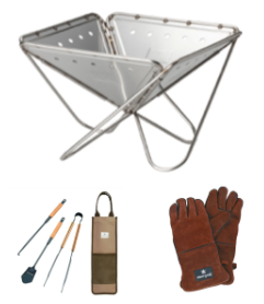 スノーピーク製焚火セット、焚火台Lスターターセット、火バサミ1個、耐火用グローブ1双