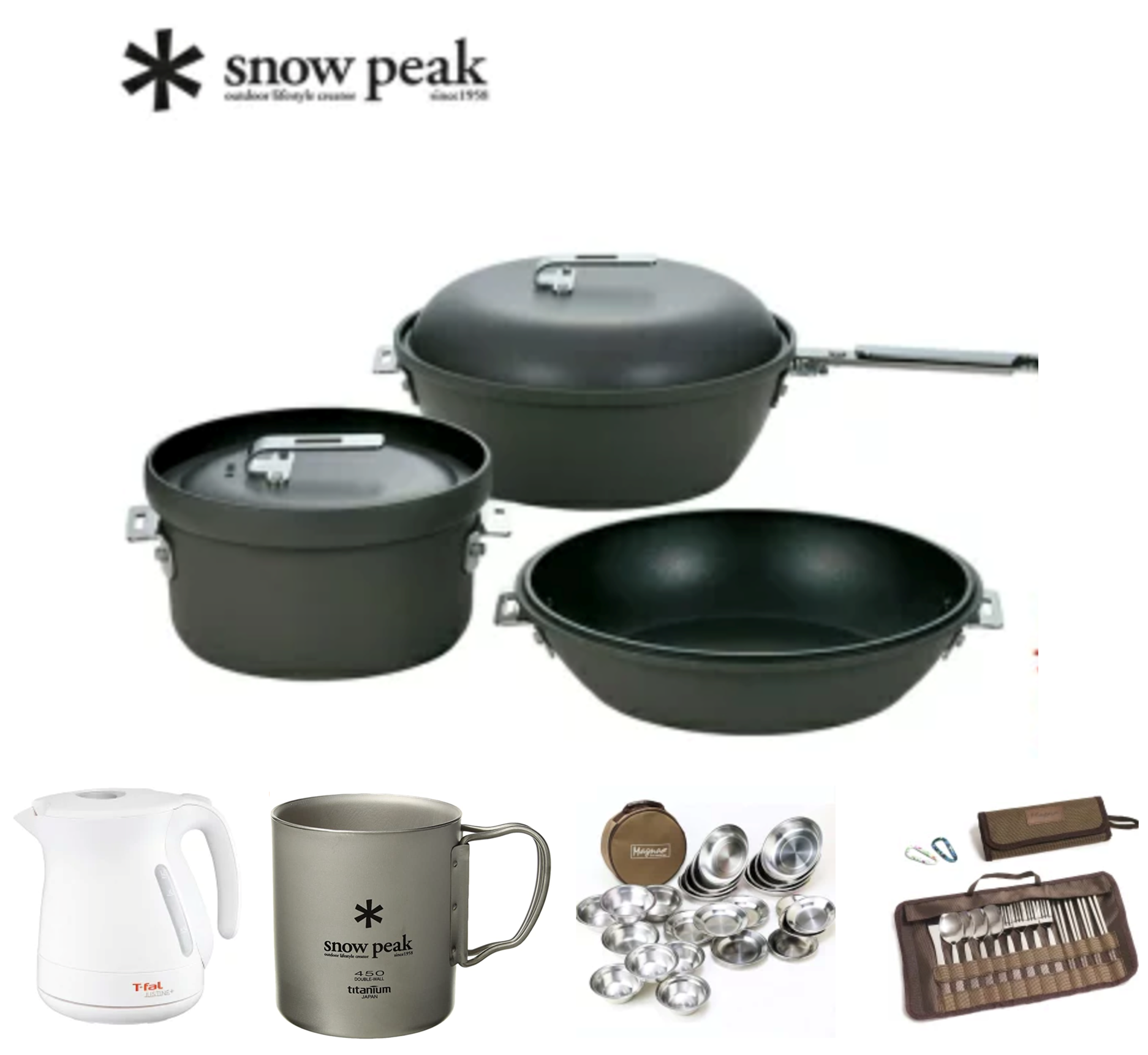 ディープ26 1個(内寸φ260×86mm 満水容量4.6l) シャロー26 1個(内寸φ260×61mm・満水容量2.8l) ライス19 1個(内寸φ190×90mm・満水容量3.3l) お箸 18.5cm 8本 スプーン 17.5cm 8本 フォーク 17.5cm 8本 ナイフ 19cm 1本 ステンレ食器セット6種類 合計24枚 ステンレスマグカップ 8個 テイファール電気ケトル 1個