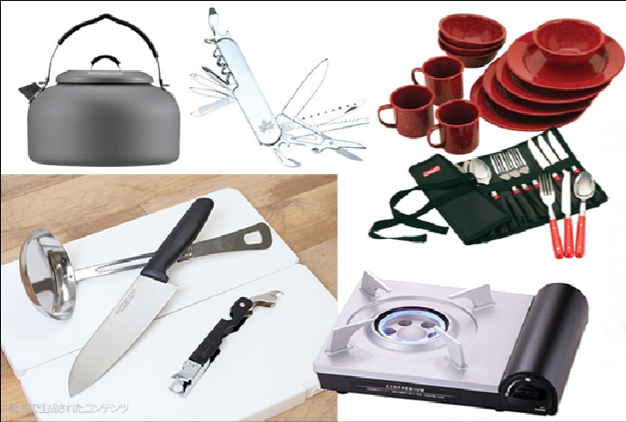 食器やお皿、まな板ハサミなどが付いたお得なキッチンセットです。 【キッチンセット】 ・ナイフとカッティングボードセットx1(ナイフ、カッティングボード、キッチンハサミ) ・ケトル ・皿セット(プレート・ボウル・カップ各ご利用人数分) ・陸軍ナイフ