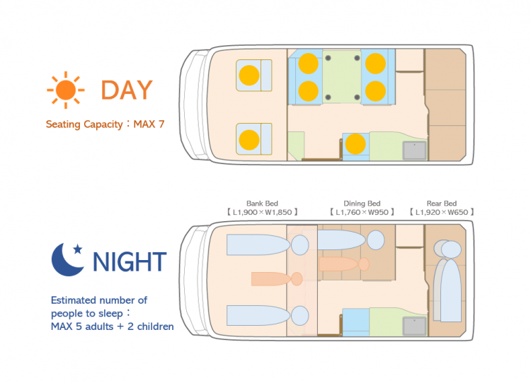 จำนวนที่นั่ง: 7 จำนวนที่นอน: ผู้ใหญ่ 5 คน+เด็ก 2 คน