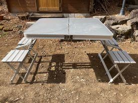 コールマン製の折り畳み式のテーブルと椅子のセットです。これさえあれば旅先で何をするにも困りません。