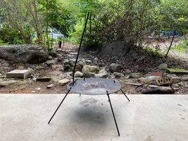 ドッペルギャンガー製の焚火台と薪スタンドです。革軍手と薪バサミもセットです。夜は火を見ながらじっくり
