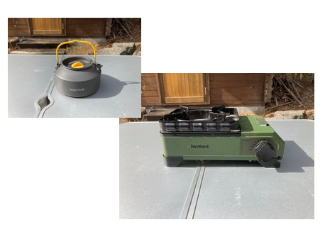 イワタニ製のカセットコンロとモンベル製のやかんのセットです。とりあえずこれさえあれば車中泊が楽しめます!